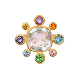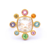 Emerald, bright blue apatite, fire opal, tanzanite and sapphires surround this beautiful moonstone.