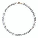Forming a row of stones, the quartz stones are cut, pierced and connected by fine gold rings.
