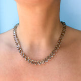 Worn over a garment, the necklace takes on the appearance of a ruff or facing.