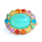 It features a blue opal surrounded by a rainbow of tanzanite, apatite, tsavorite, yellow sapphire, orange sapphire, pink sapphire and amethyst.
