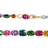 Tourmalines and amethysts carved, pierced and connected by fine gold rings, seem to float on the skin.