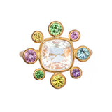 Émeraude, apatite bleu vif, opale de feu, tanzanite et saphirs entourent cette belle pierre de lune.