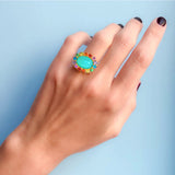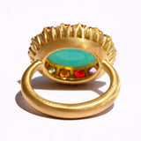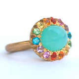 Celle-ci est composée d'une opale bleue entourée d'un arc-en-ciel de tanzanite, apatite, tsavorite, saphir jaune, saphir orange, saphir rose et améthyste.