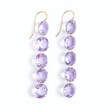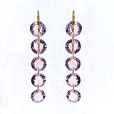 Les boucles d'oreilles Rivières sont composées de cinq améthystes aux reflets lilas, taillées, percées et reliées par de fins anneaux d'or.