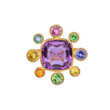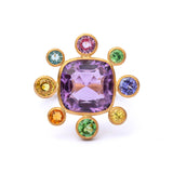 Tanzanite bleu profond, saphir rose, grenat tsavorite, apatite bleu vif, saphir lilas et saphir jaune entourent cette lumineuse améthyste.